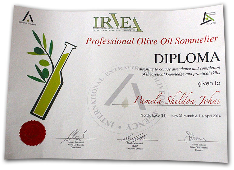 Pamela, your certified olive oil expert, will give an overview of olive oil, touching on the different regions, varieties of olives, cultural and agricultural practices (weather, pruning, insects and blights, timing/mode of harvest). She will discuss the traditional method of how olives are pressed, and explain the modern methods and their effect on the oil. She will instruct on how to taste olive oil, how to recognize defects, read the labels, what qualities to look for, how to use it, and how to store it.